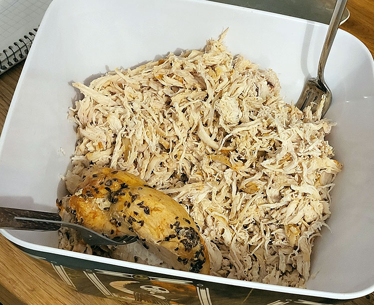 Хоть я про него уже рассказывала – это не помешает мне рассказать еще раз. Во-первых, надо сварить куриную грудку (я варю в пакете). После этого при помощи двух вилок разделить грудку на волокна как на фото выше.