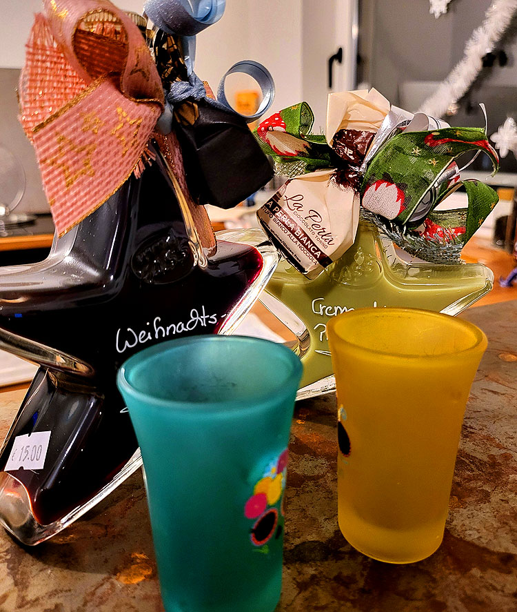 И еще одна рождественская картинка в конце. Рождественские ликеры. Я не знаю, продаются ли они круглый год -- мы не видели, мы их видели только на новогодних ярмарках. Один густой \*\*Cremelikör mit Pistazie \*\*-- сливочный ликер с ярким фисташковым вкусом. Второй вообще называется "Рождественский ликер" **Weihnachtslikör**-- и на вкус как Рождество: корица, гвоздика, имбирь, мускатный орех -- все тут! Тоже продается исключительно на рождественских ярмарках -- и создает классное рождественское настроение.