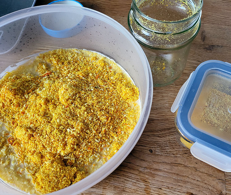 Пропорции у меня были такие. На 1,5 стакана мандариновой муки я взяла 2 стакана молока (молоко было миндальное, но можно любое). Молоко подогреть до “почти кипит” – и залить в корки, чтобы они запарились. Сюда же нужен стакан сахара – я заменила эквивалентным количеством сах.зама.
