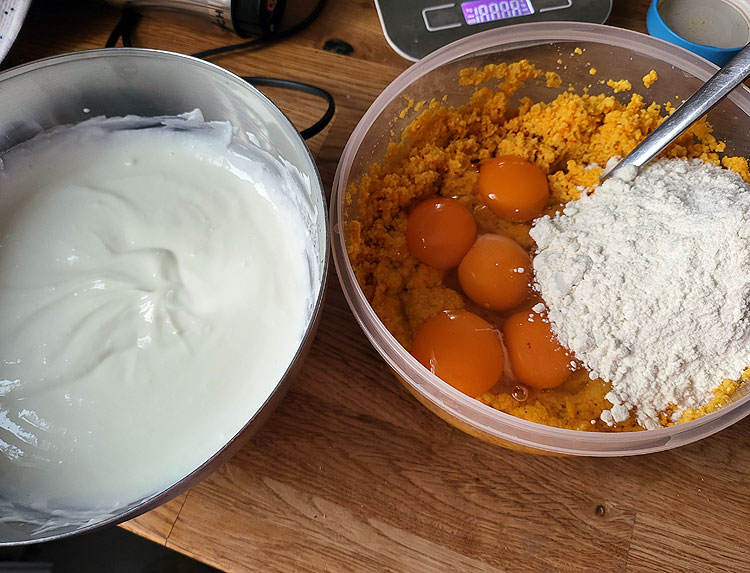 К мандариновой муке добавить 1 стакан (с плечиками) обычной муки, 5 яиц, пакетик разрыхлителя (или чайную ложку соды, гашеной уксусом).