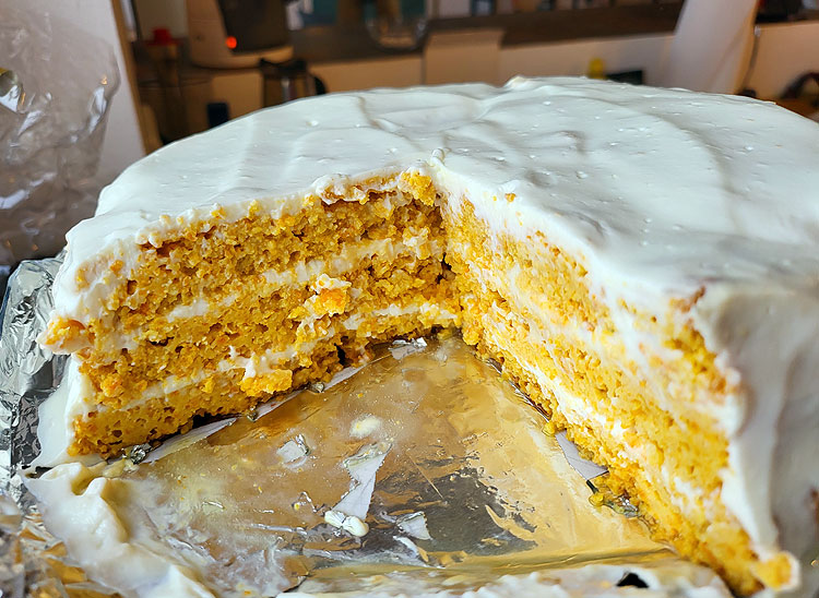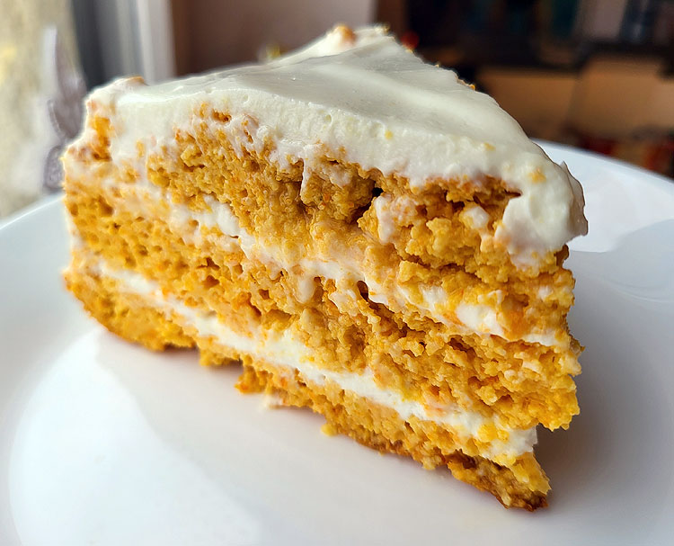 Торт специфический. У него неоднородная структура. Шероховатая. Из-за мандариновой муки. С помощью блендера мука получается тоньше, чем с помощью мясорубки. Мне больше понравилось. Но надо очень следить, чтобы не было кусочков. Можно сначала через мясорубку, а потом еще блендернуть.