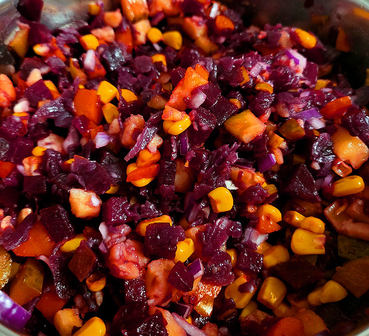 На новогодний стол опять готовила винегрет. Муж очень просит уже который год подряд. Но горошек забыла купить -- вместо него бросила кукурузы.