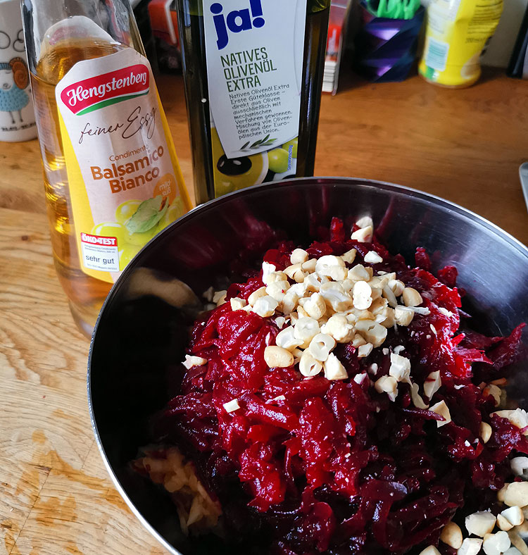 В вашем детстве тоже был этот салат из свеклы и майонеза с черносливом и грецкими орехами? Мы его называли “королевский”. Этот салат из свеклы чем-то похож, но без майонеза. Тертая свекла, тертое яблоко, обязательно зубчик чеснока через чеснокодавку. Какой-то сухофрукт кусочками (у меня были финики) и орешки – по желанию. У меня было немножко кешью.