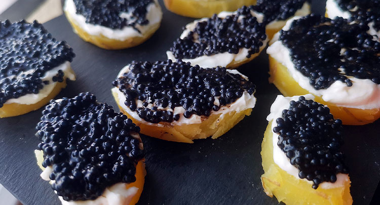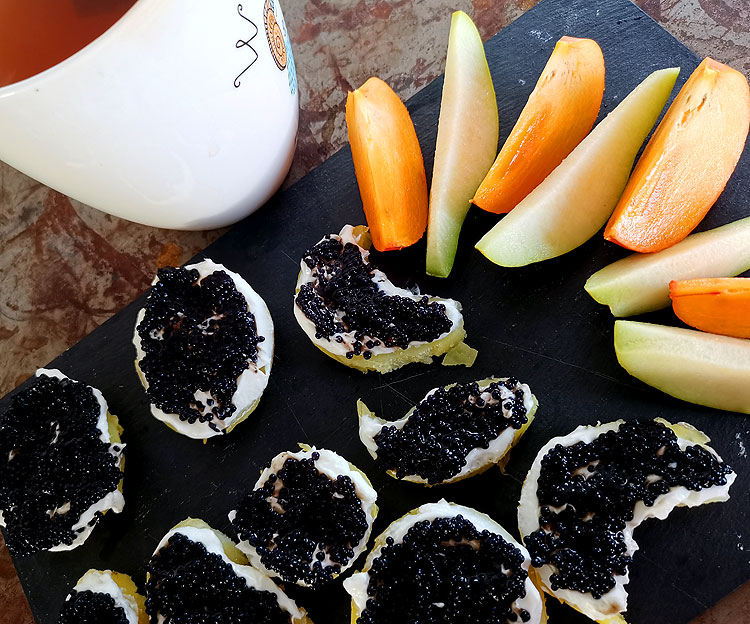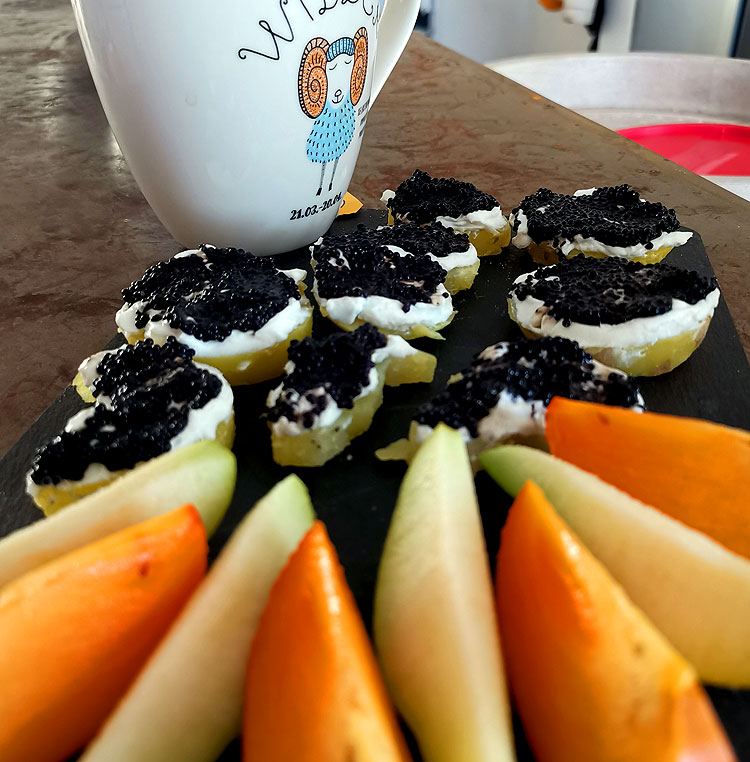 Икра вкусная. Кроме икры тут мягкий сыр – что-то типа солоноватого маскарпоне. А вот инновация этих бутербродов в том, что они не на хлебе, а на кусочке вареной картошки.
