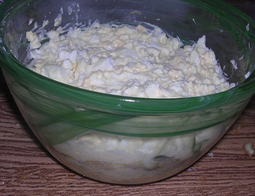 Из вчерашней вареной картошки, банки шпрот, вареных яиц и майонеза соорудился слоеный салатик. Кстати, вычитала где-то идею, что каждый слой надо не смазывать маойнезом, а размешивать слой с майонезом в отдельной миске, а потом выкладывать. Как ни странно, у меня при такой методе майонеза уходит меньше, а салатику не обязательно настаиваться и пропитываться. Салатик получился вот такой: