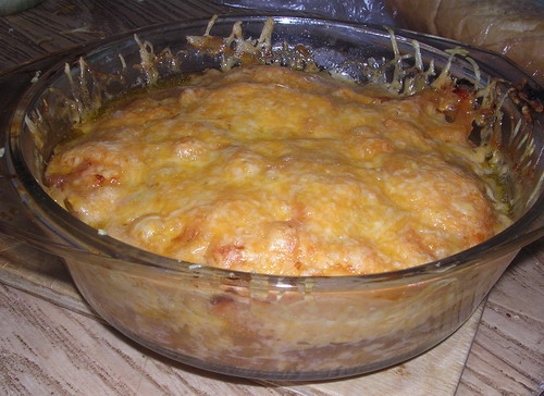 А кусочек свинины разморозила, в середине разморозки порезала как на отбивные. Минут 30 помариновала в соевом соусе (соевый соус+растительное масло+соль+сахар+перец+лук). В форму выложила слоями: свинина, помидор, сыр тертый, свинина, помидор, сыр тертый. Останки маринада вылила туда же. Сверху сыра побольше, побольше. Выглядело, конечно, абсолютно так же, как и любое другое блюдо с сырной корочкой сверху: