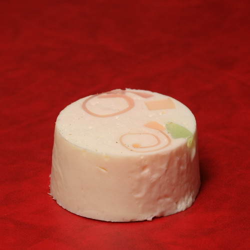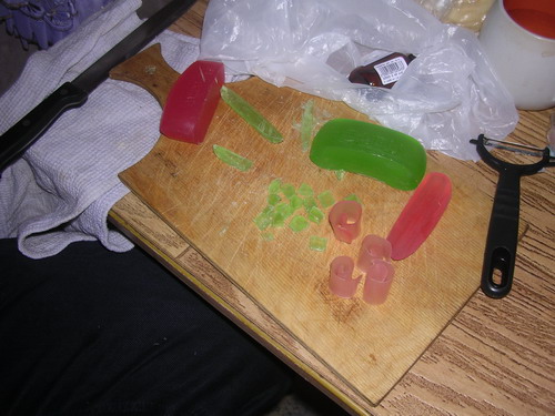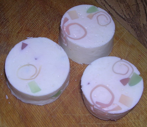 Пока жена мешает тесто (можно взбивать массу миксером – выйдет только лучше), муж может сделать украшение. Для украшения хорошо подходит цветное мыло. Цветное мыло надо порезать на кубики или срезать с него овощечисткой полоски. Из полосок скрутить спиральки. Кубики добавить в мыльную массу и быстро ее разлить по формочкам (пока кубики не расплавились). формы берем хотя бы с полстакана, а то маловатый кусок мыла выйдет. Спиральки можно ставить в формы, а можно потом вдавливать в уже налитую мыльную массу.