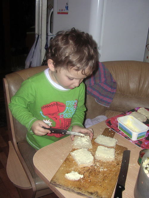 Вобще-то это я делала бутеры с икрой, но пришел Динь и сказал, что я из хороших бутеров с маслом делаю какую-то дрянь. Поэтому, типа, уходи мать и не мешай. Сел сам бутеры маслом мазать.