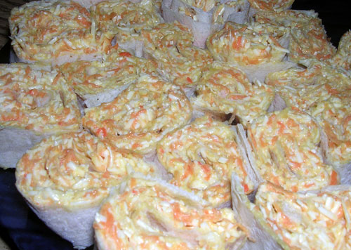 Этим же салатом можно фаршировать блины (только потом не греть, фаршировать перед самым поеданием). А можно просто лопать его вилкой из общей чашки.