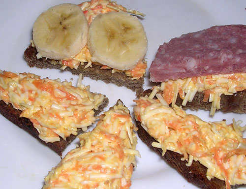 И маленькие бутербродики-канапе. Кто любит более классические сочетания вкусов, может добавить к бутербродику колбасу, но я люблю сюда неожиданно добавить сладкую нотку. Например, хлеб взять с изюмом. Или положить на бутербродик ломтик яблока, половинку виноградины, пластик банана. Забавно.