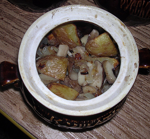 А тут вдруг знаете, как мне повезло? Мне бабушка собрала и притащила небольшое ведерко белых грибов. И снова, по летнему: грибы свежие, только срезанные, их соусами сложными поливать – только портить. Поэтому у нас сегодня было жаркое из белых грибов в горшочках. Ингридиентов минимум: грибы, картошка, лук. Все отдельно обжаривается, в горшочке встречается, и еще минут 40 в духовке стоит. Вкус из-за свежих белых грибов – обалденный.
