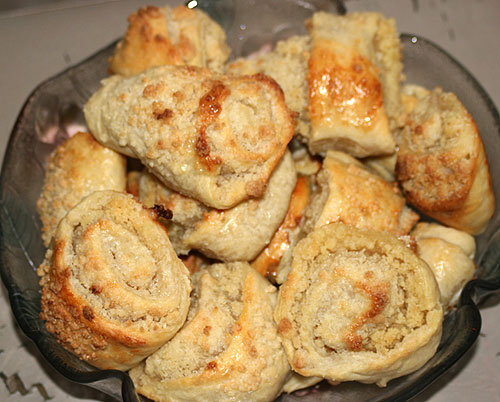 На десерт пекла плюшки по этому рецепту. Не зря же автор рецепта предупреждает: скатывайте рулет потуже, а то начинка высыпется. Высыпалась. Ну, ничего! Мы эту начинку подобрали и сверху ею булочки посыпали – только вкуснее стало.