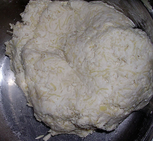 Для теста смешала 250 грамм творога, стакан муки, стакан крахмала чуть соли и 4 тертые на мелкой терке картошки. Такого огромного восторга от теста, как обещала автор рецепта, я не испытала. Тесто рвалось, мнулось и гнулось, а так же прилипало к скалке при попытке его раскатать. Всыпала еще полстаканчика муки, но не сильно помогло. Тем не менее, все это не помешало мне налепить-таки пызов (т.е. таких колобочков из этого теста, внутри у которых фарш).