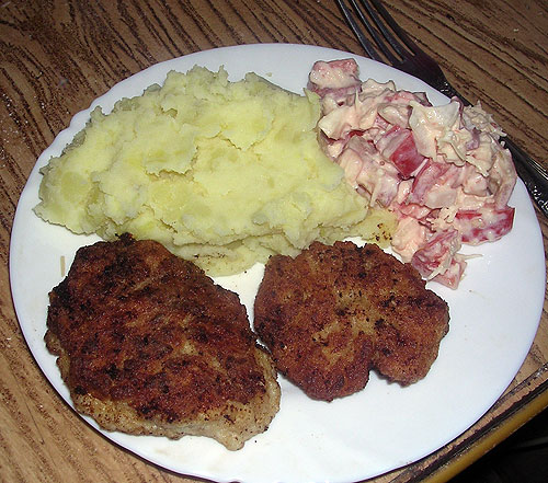 А на гарнир к котлеткам – обычное картофельное пюре. И простой но любимый помидорный салатик (помидорка, лук мелко, тертый сыр, сметана).