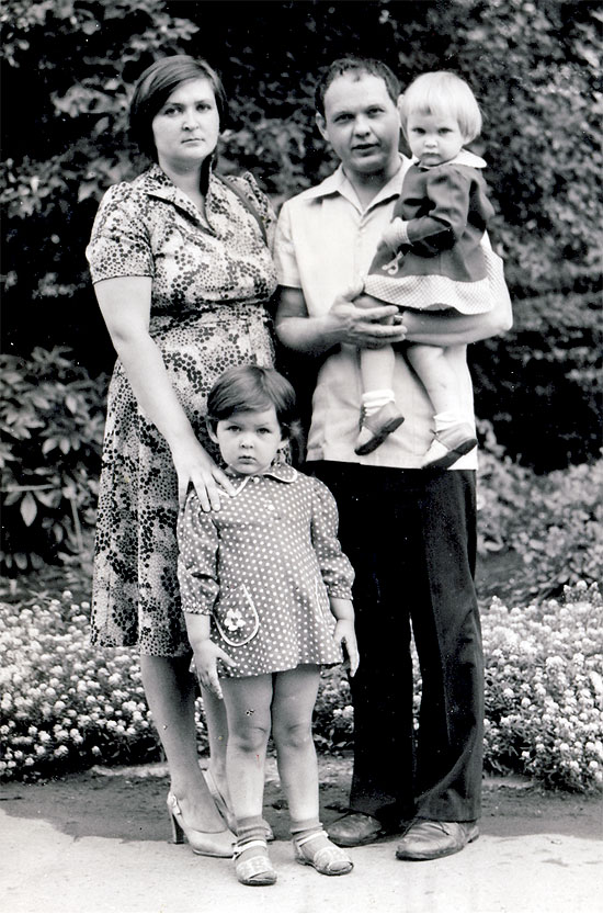 А вот наконец фотография всей нашей семейки: мама, папа, моя сестричка и я. Маме в этот день исполнилось 27 лет. И вобще на всех фотографиях в этом посте моя мама странно-загадочным образом моложе, чем я теперь. Как мама может быть моложе меня? Загадка.