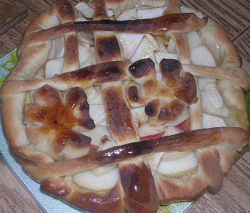 Вобщем, потом я пирог варьировала-варьировала и выяснила следующее: как яблочный пирог ни готовь, все равно вкусно выходит. Почти как крылья куриные. Основная идея, думаю, понятна: тесто надо чем-то смазать. Вареньем, медом, сахарным сиропом. Один раз вместо смазывания – поливала соком половинки лимона (с сахаром и корицей, растворенными там же). Выложить на смазку яблоки. Посыпать сверху ягоды. В ход шли: ирга, клюква, брусника. Сверху все это присахарить. В сахар можно добавлять корицу, ваниль и еще что охота. Сверху сделать плетенку. Я плетенку маленько смазываю сладкой водичкой.