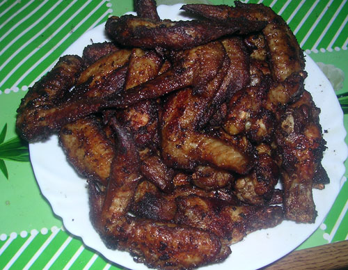 Отсюда вывод: крылья куриные, как ни готовь, выйдет объедение. Основная идея такова: крылья чем-нибудь посыпаем, заливаем какими-нибудь соусами. Все варьируется абсолютно свободно в пределах собственной наглости (в следующий раз хочу крылья в молотой бруснике с сахаром замариновать). А потом либо в духовку, либо жарим на сковородке (в полуфритюре). На праздничный стол не пойдет, потому что очень пачкает руки, а вот на пивной – самое оно.
