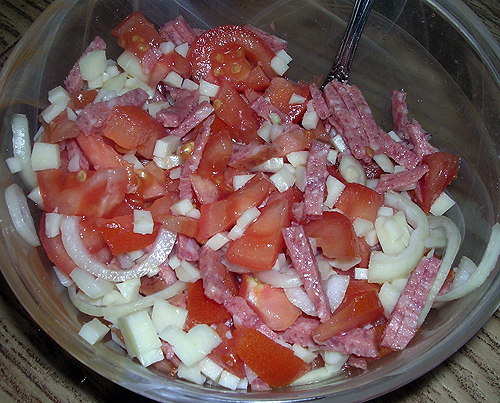 Ну, а для пущей радости, пока все это готовилось, я еще настрогала салатик вот такой (заправляла сметанкой):