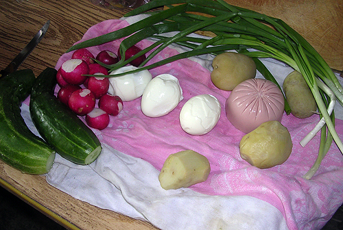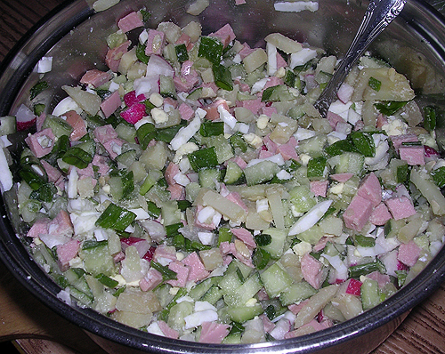 превращается в окрошку (если заправить квасом или кефиром, или минералкой) или в салат (если заправить сметанкой):