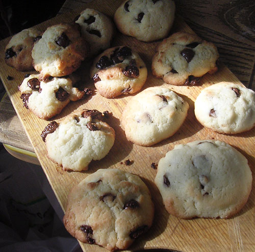 Духовку натопила жарко. Лист смазала кусочком масла, и выложила на него печенюшки. Пробовала выкладывать печеньки ложками. Получается ерунда. Неудобно, форма некрасивая, и те кусочки, которые по бокам печеньки выступают при выпекании расплавляются и вытекают из печенюшки. Тогда стала печеньки просто лепить руками, причем шоколадные кусочки стараться запихивать чуть внутрь печеньки. Руками получилось отлично: ровно, аккуратно, и шоколад весь остался. Выпекала на верхней полочке духовки 8-10 минут (в середине поворачивая лист, а то задние сильнее зарумяниваются).