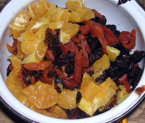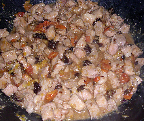 Свинину (у меня была лопатка, 2 кг) я нарезала кубиками. Параллельно нарезала чернослив, курагу и апельсины (чернослив и курагу полосками, апельсины кубиками). Вместо апельсинов более по-китайски было бы взять мандарины, но у меня были апельсины :) 2 апельсинки и грамм 300-400 сухофруктов.