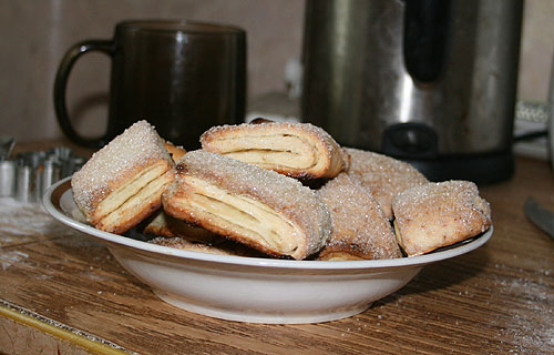 Тесто замесить такой плотности, чтобы его можно было раскатывать скалкой. Раскатать скалкой до толщины полсантиметра или меньше, смазать пласт теста сахаром, свернуть пополам. Еще чуть-чуть прикатать скалкой, смазать сахаром и снова свернуть пополам. Такой 4-слойный пласт порезать на квадратики 4 на 4 см (а высотой они около 1,5 см). Обмакнуть еще в сахар и выложить на лист сахарной стороной кверху. Выпекать в жаркой духовке на средней полочке до красивого цвета и запаха. Если теста вышло через чур много, оно замечательно хранится в морозилке почти сколько угодно. И в холодильнике до 3 суток точно.