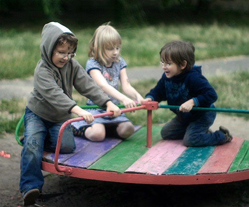 В чем проблема? Проблема в том, что на улице почти нет детей их возраста. Во многом это связано с тем, что родители пятилеток их не отпускают гулять в одиночестве. А садик наш находится далеко, поэтому с окрестными детьми иы еще и мало знакомы (так бы можно было хоть с садиковскими друзьями гулять). Дети, которые гуляют с мамами, очень плохо знакомятся с моими. Мои прыгают по лужам; возятся в песочнице (не копаются, а именно возятся в песке, грязные потом как черти); залезают на вершинку “паутинки” или высоко на лестницы – другим детям все это нельзя. Мамочки их забирают и уводят. (Если дети гуляют не одни, а со мной, то все точно так же, только мамочки еще перед тем, как гордо удалится, орут на меня, что я не умею детей воспитывать).