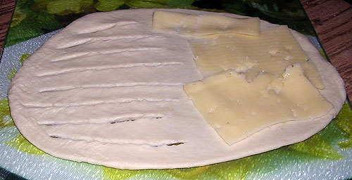 Даем тесту подняться в 2 раза (примерно часик). После этого отрываем кусочки размером с грецкий орех, раскатываем довольно тонко в лепешку, на одну половину лепешки выкладываем тонко порезанный сыр, в другой половине лепешки делаем прорези.