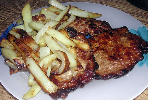 Вобщем, поступила как всегда в подобных случаях: сделала самое простое. Мясо разрезала на тонкие ломти (примерно 7 мм) поперек волокон. В миске смешала чайную ложку соли, полчайной ложки белого перца, столовую ложку растительного масла и столовую ложку соевого соуса. Мясо обтерла этим и отложила на полчасика. А потом обжарила на самой раскаленной сковородке, какую смогла сделать, по одному куску (это важно, чтобы на сковородке не было много кусков сразу, а то они дадут много сока и мясо начнет тушиться, а так – жариться).