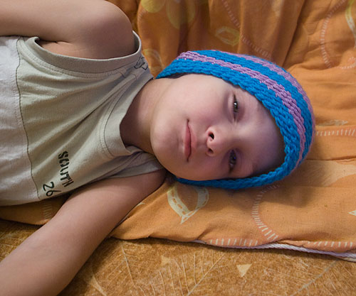 Взяли меня дети на слабо. Проходят в садике тему "одежда и обувь". Денис, мечтательно: -- А у Алены мама вязать умеет. -- Я тоже умею! -- А Алене мама шапку связала... -- А я возьму и тоже свяжу. -- Завтра? Пришлось идти нитки покупать. Вязать 2 шапки. Мамуля моя тоже подключилась, связала 2 шарфика.