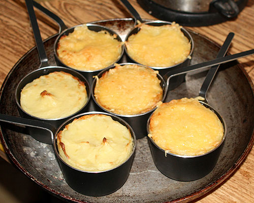 На этой неделе у меня была картофельная запеканка в кокотницах. С мясной начинкой, с грибной начинкой, со смешанной начинкой, без начинки совсем (по заказу Дениса). С сырной шапочкой или без сырной шапочки (а еще можно делать верхнюю корочку из сметаны – получается румяно, почти как сырная шапочка).