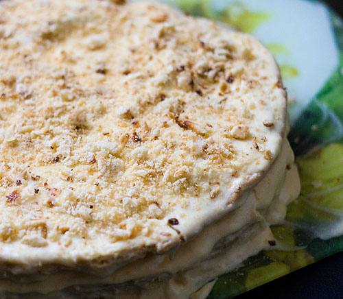 Когда испекла все 6 коржей, засунула торт и крем в холодильник. Через полчасика достала и остатки крема безжалостно вылила на торт, промазав его и с боков, насколько уж смогла. ))