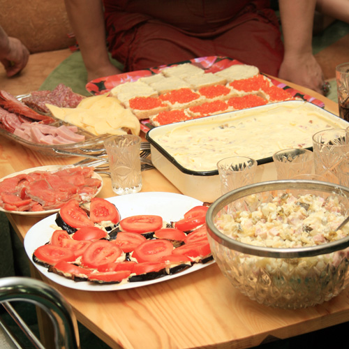 - Еще иногда “не готовлю” салаты. Это “помидоры + огурцы + зелень + сметана”; “помидоры (в идеале бурелые) + чеснок мелко + раст.масло”; “красная капуста + майонез”; “тертое что-то с чесноком + майонез” из морковки, колбасного сыра, редьки и т.д.