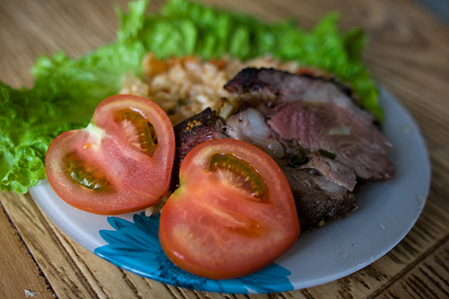 Помидоры. Можно взять черри. Но у меня омские обычные очень вкусные некрупные помидорки.