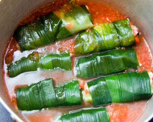На картинке показаны только зеленые рулетики. На самом деле, зеленые листья у меня кончились раньше фарша. Поэтому в дело пошли и белы части лука. (Изначально я белые просто отрезала и хотела их использовать как обычный салатный лук – мне очень нравится вместо обычной “репки” добавлять в салаты порей).