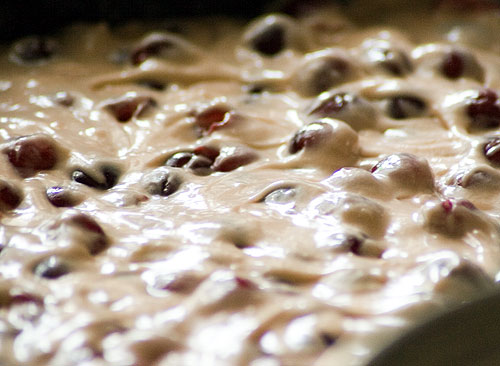 Вишню я забросила прямо в тесто и размешала. Получилось примерно вот такая концентрация вишни в тесте: