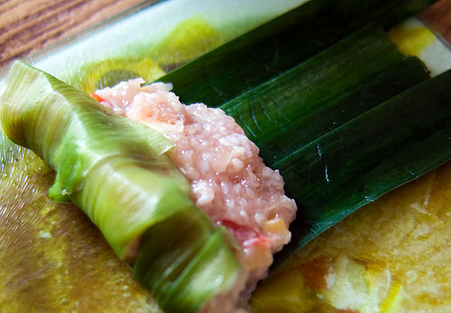 Теперь взяла широкие полоски лука-порея примерно одинаковой длины. 5 минут прокипятила их в кипятке. Полоски лука-порея разложила, положила на них ложку фарша, скрутила рулетом.