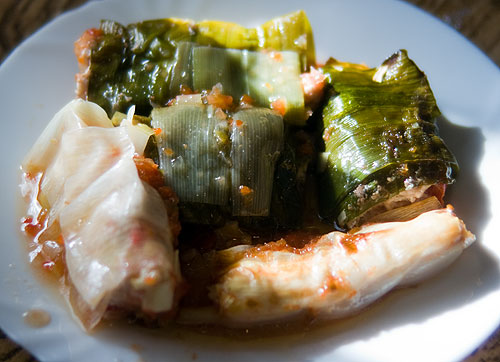 Те голубцы, которые с белым луком – очень нежные. С зеленым луком мне тоже очень понравились, но они чуть грубее; однако, по-моему, нежнее, чем с капустой.