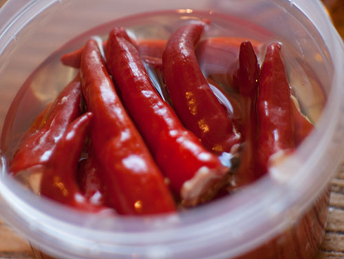 Подавать вот так. Некоторые перчики остались довольно острые, некоторые почти потеряли остроту. Но и к тем, и к тем очень хорошо подходит хлебушек.