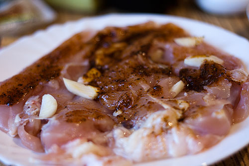 На распластанную грудку помазала мой соус; положила кусочки чеснока. Некоторыми кусочками чеснока курицу нашпиговала. Сюда же сверху положила мелкие кусочки мяса, которые оторвались от курицы в процессе обдирания от костей.