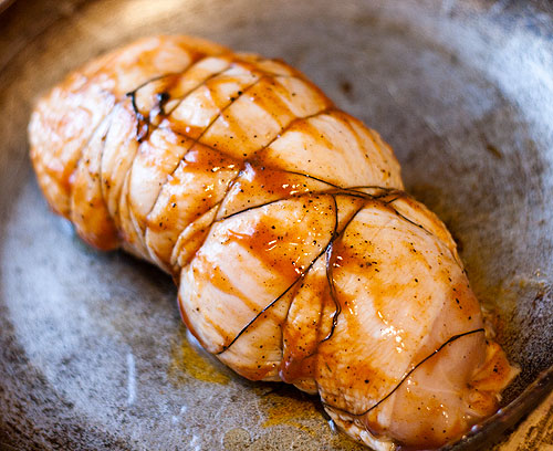 Духовка уже горячая? Лист смазываем растительным маслом (без фанатизма), выкладываем на него грудку. Снаружи (и сверху, и снизу, и с боков) грудку обмазываем тем же соусом. В духовку ровно на 15 минут. Духовку выключаем. Но 2 часа не открываем, а грудка стоит, доготавливается в остывающей духовке. Думаю, для двух грудок время увеличивать не надо.