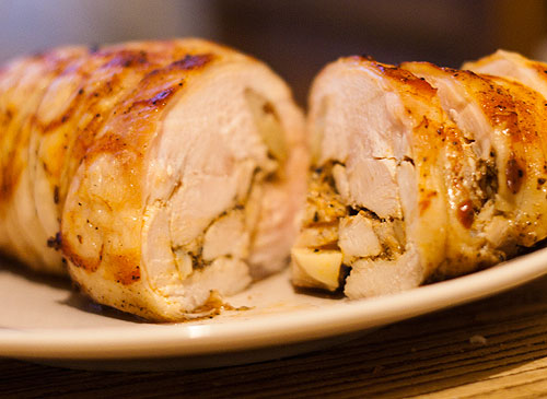 Шкурка не становится хрустящей, но и не вареная. Какая-то странная. Я не думаю, что она обязательный атрибут, но она была достаточно к месту, с ней все выглядело опрятнее и красивее как-то. В нее весь кусок завернулся и получился как рулет. По виду очень похож на покупные рулеты “Праздничный”, “Домашний” и т.д. от Сибирской птицефабрики. (мы эти рулеты любим). Муж даже удивлялся, где я такой вкусный и острый рулет купила.