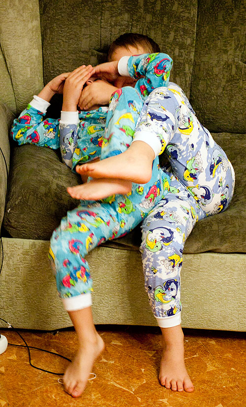 На следующий день, конечно, опять драка. И даже фотография не помогает разобраться, где чья пижама. Мне-то помогает, но детям она совершенно не служит доказательством: они ожесточенно спорят, кто в какой пижаме (оба претендуют на одну).