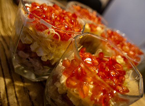 В стаканы выкладывать слоями: Курица - орешки - зерна граната - яйца - сыр - зерна граната.