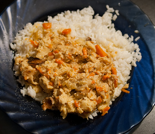 Одну луковичку порезать мелко. Одну морковку порезать тонкой соломкой. Лук начать обжаривать, потом добавить морковку. Рыбку (филе, грамм 400-500) посолить, поперчить, сложить в сотейник/кастрюльку. Добавить сюда же обжарку из морковки/лука и грамм 150 сметанки. Чуть перемешать. Закрыть крышкой и тушить минут 20-30. Очень вкусная рыбка. Подавать с рисом обыкновенным отварным или с картофельным пюре.