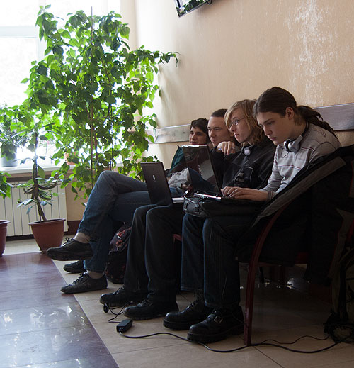 Такая картинка: студенты с ноутами на диванчиках первого этажа – инвариантна относительно того, пара сейчас или переменка. Хотя большинство коридоров во время занятий абсолютно пустые.
