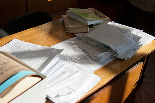Вон тот стол, где розовая сумка – мой. Ближний стол, на котором газета – папин, его так никто и не занял с тех пор.