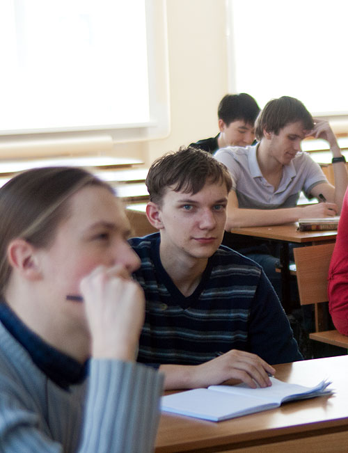 Некоторые задачи решает студент, который находится у доски. Некоторые задачи решают студенты коллективно, а тот, кто у доски просто фиксирует коллективную мысль так, чтобы всем было видно. Около половины задач (зависит от группы: в некоторых группах до 90% задач) решает на самом деле преподаватель, а студенты только записывают. Это не страшно, это нормальный образовательный процесс (хотя студенты этого очень боятся).