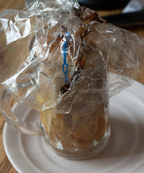 Противень с высокими бортами засунула в подогретую духовку. Пивные кружки в него. Еще воды в него налила (поллитра). Оставила в покое на 1 час 20 минут. Достала. Остудила ночь (сначала на столе стояли, когда просыпалась ночью – поставила в холодильник).