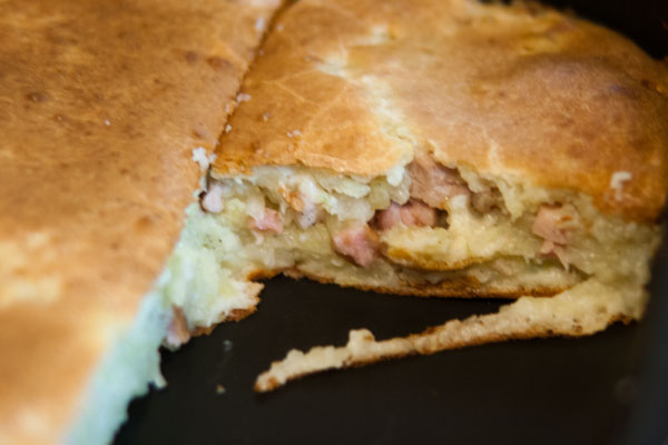 Дальше как обычно: выливаем в форму половину теста. Выкладываем начинку. Выливаем оставшееся тесто. В духовку на 30-35-40 минут в зависимости от количества получившегося пирога.